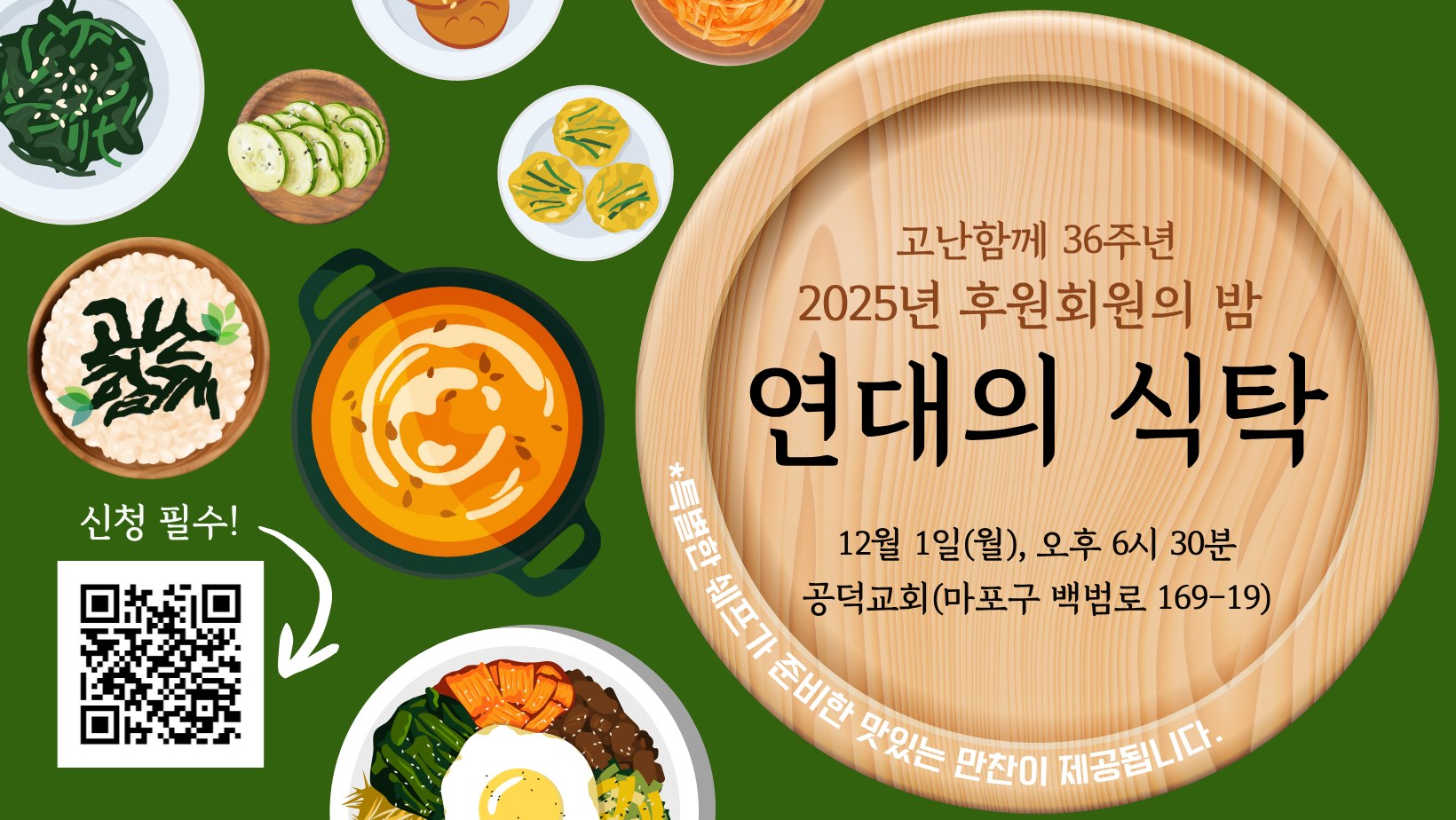 *풀코스 저녁 메뉴를 제공하고 참가비는 따로 없습니다. 다만 음식준비를 위해 11월 28일 밤 10시까지 아래 구글폼으로 신청해주시면 큰 도움이 될 것입니다.