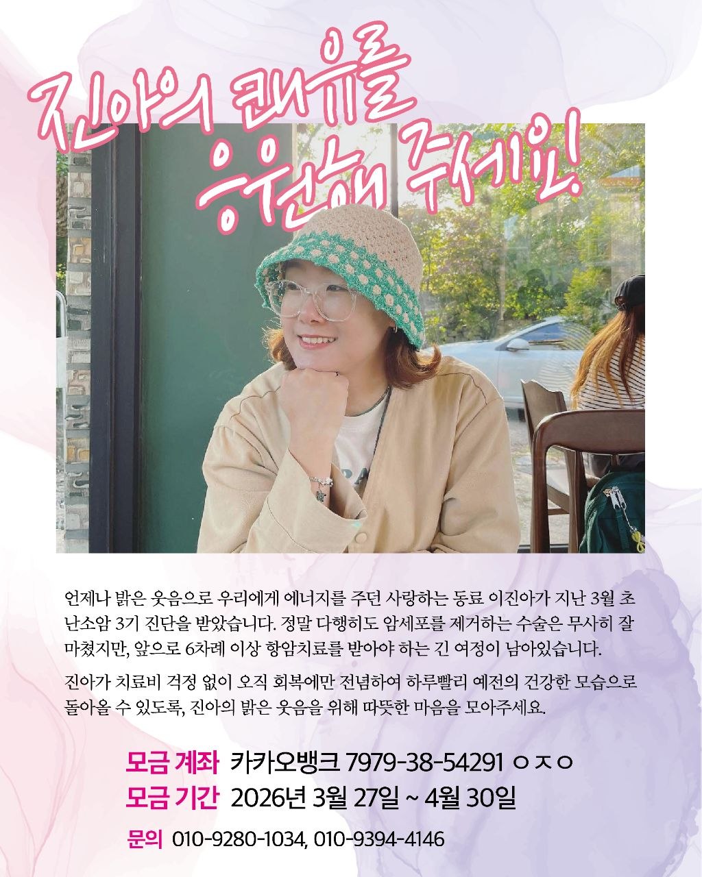 우리의 소중한 친구, 이진아의 쾌유를 위해 응원의 마음을 모아주세요. 한 사람 한 사람의 따뜻한 응원이 모여 큰 힘이 됩니다.